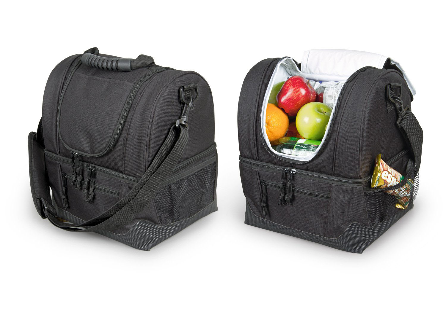 Con recubrimiento interno para conservar las temperaturas, dos compartimientos para alimentos y malla para termo, bolsillo externo pequeño, materiales segun diseño y presupuesto