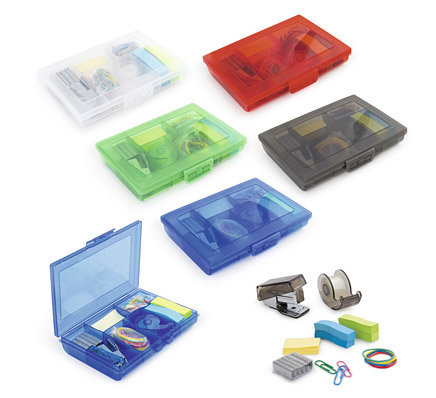 Estuche plástico que contiene Cosedora, ganchos de repuesto, dispensador de cinta adhesiva, clips de colores, bandas de caucho.