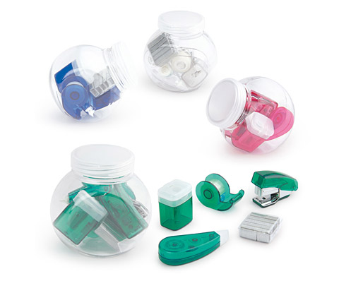 Publicada enero 27, 2016 a las 497 × 398 en OFICINA SET GENIUS Kit plástico Contiene cosedora, ganchos de repuesto, dispensador de cinta adhesiva, corrector portable y tajalápiz.