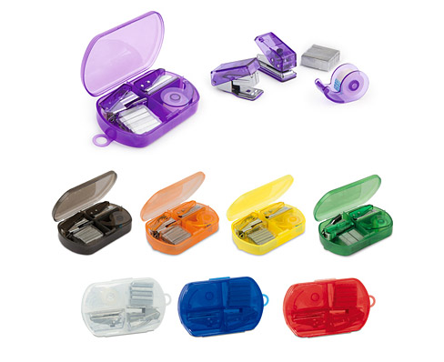 Publicada enero 27, 2016 a las 488 × 398 en OFICINA SET STANDFORD Estuche traslúcido que contiene Perforadora, dispensador de cinta adhesiva, cosedora y ganchos de repuesto.