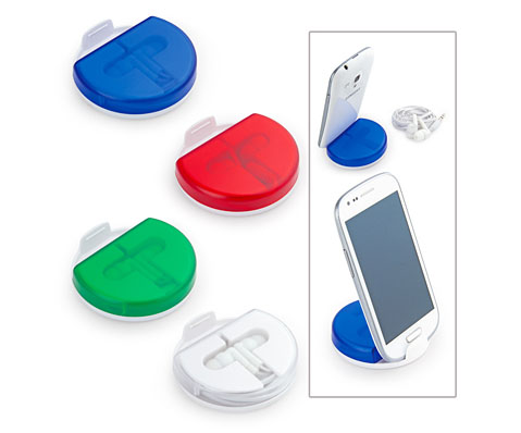 Audífonos mini. Intrauditivos, en estuche plástico convertible en holder para celular. Plug conector de audio estándar.