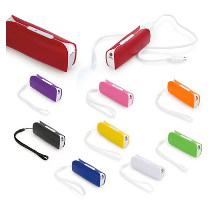 Banco de energía plástico. Contiene cable cargador USB Micro USB. Batería de Litio con capacidad de 2.000 mAh. Incluye linterna incor.